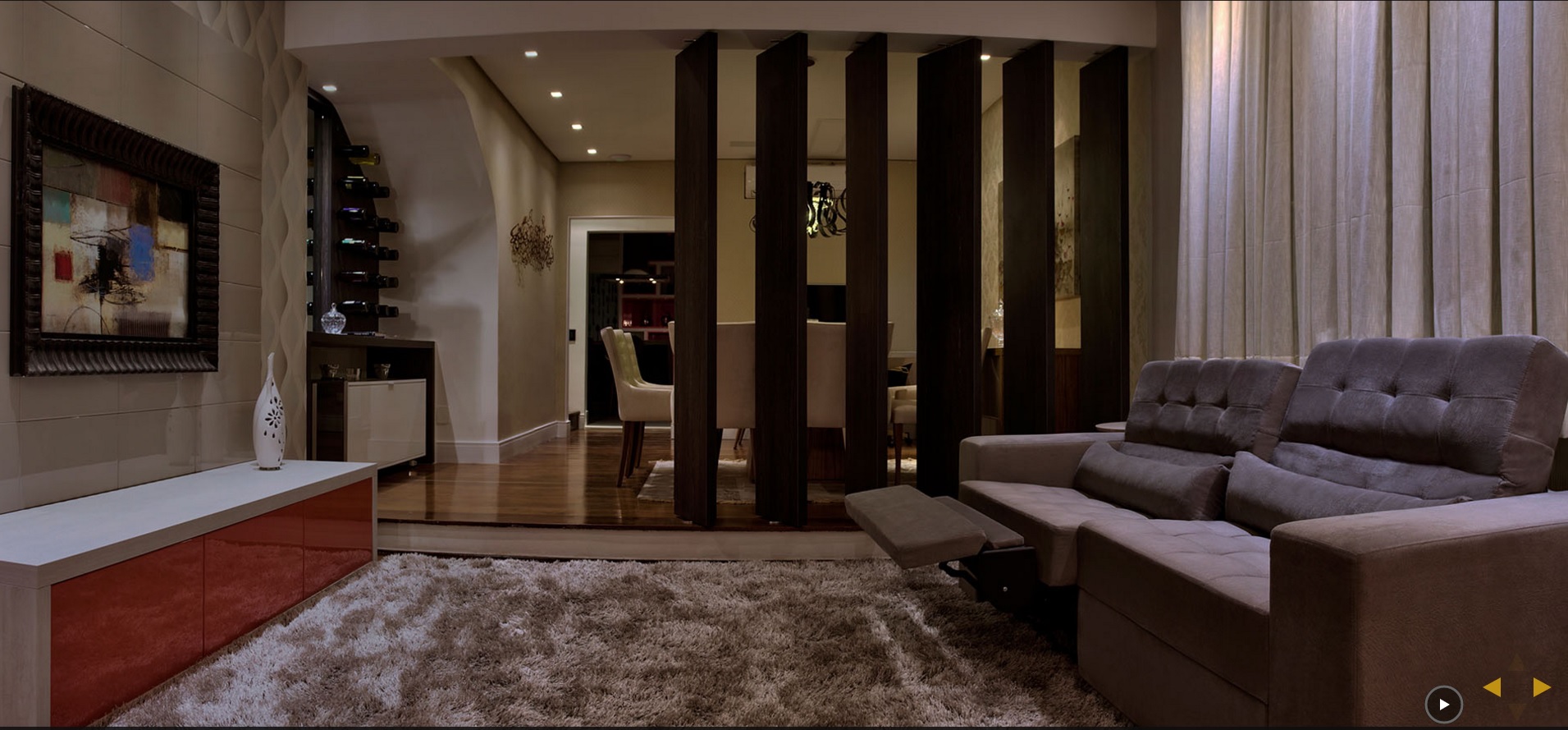 Sala de TV com controle e dimerização Lutron, caixa acústica invisível Sonance, Televisão escondida atras de Lift tipo quadro com motor Lutron, trilho de cortina motorizado, tudo controlado através do iPad.